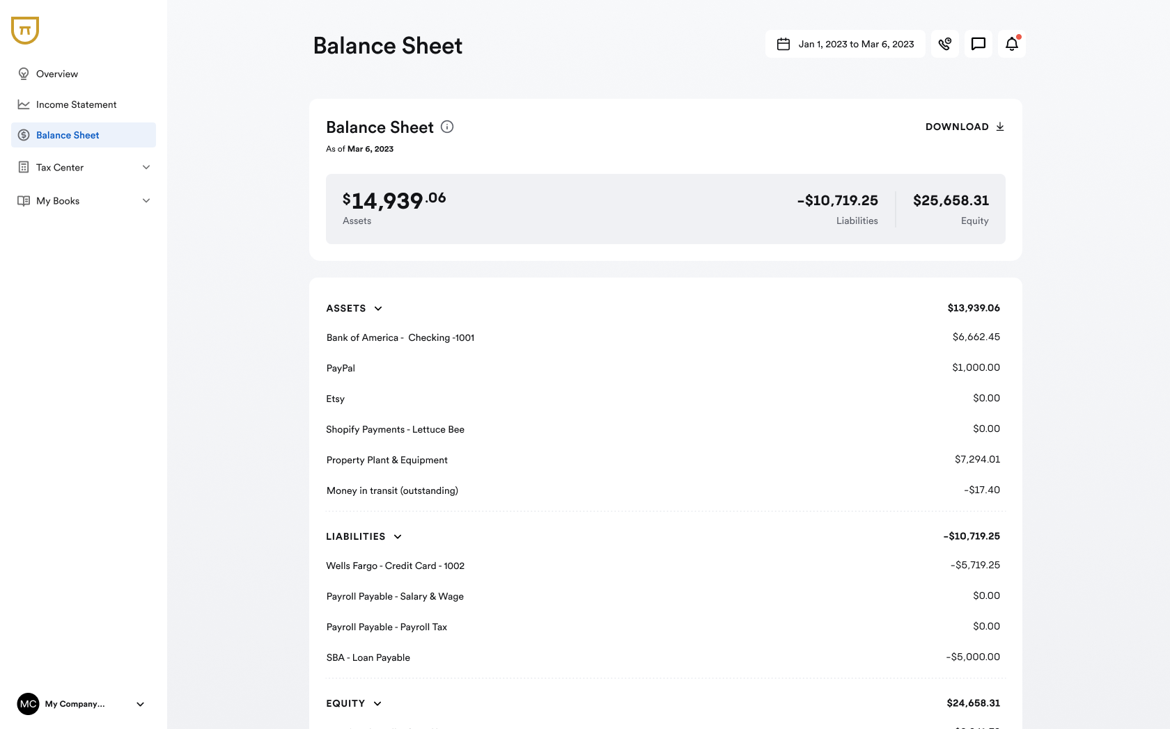 Prepared monthly by your Bench bookkeeping team, your balance sheet includes: