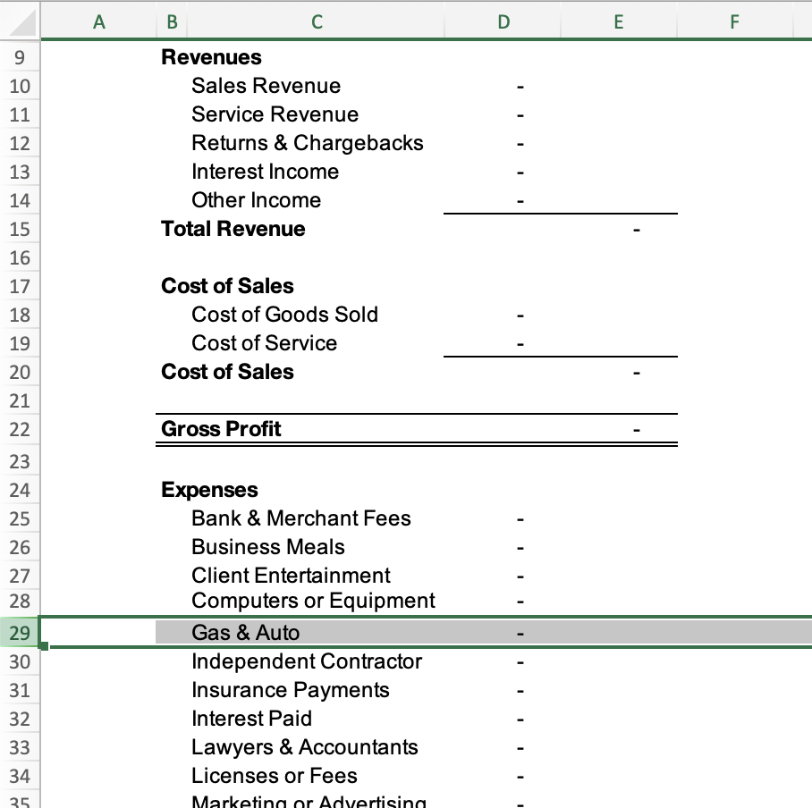 By default, the income statement includes data for every account listed in the Chart of Accounts. If you’ve added or removed accounts from the Chart of Accounts, make the same changes to the income statement. For instance, if you don’t track “Gas & Auto” as an expense, delete the row.