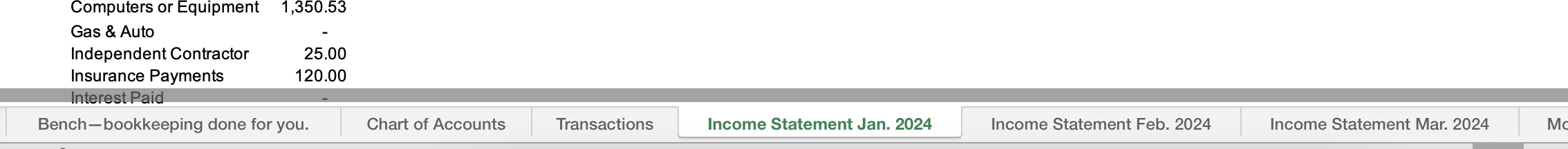 There are three sheets in Bench’s income statement template: