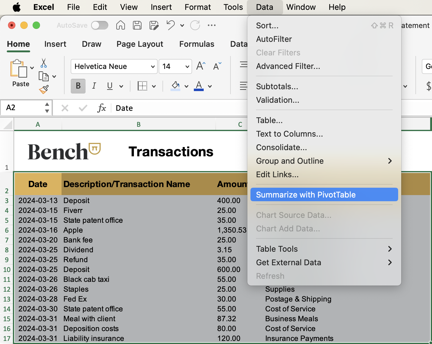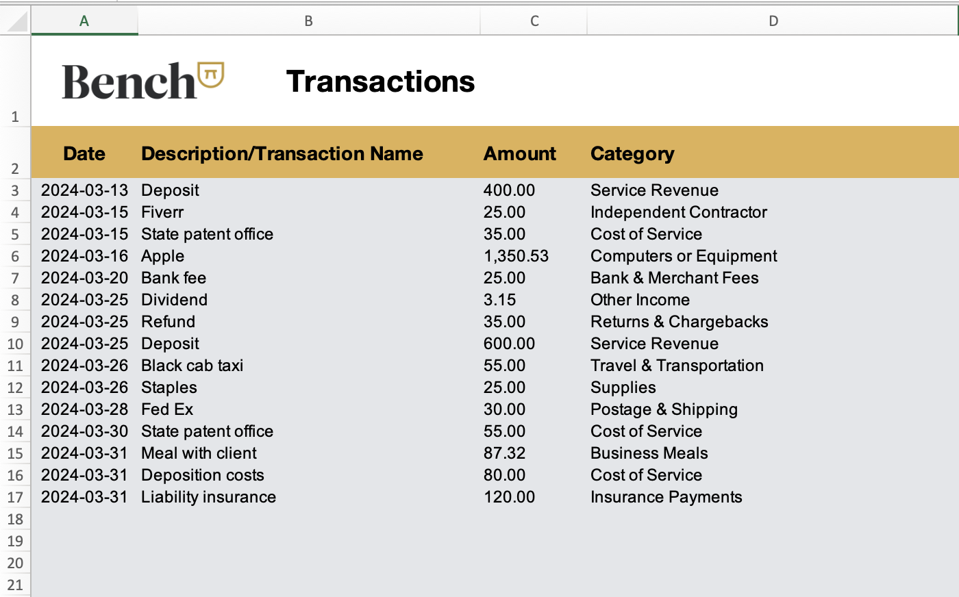 When you use Bench, your transactions are automatically imported and categorized for you. But for DIY bookkeeping in Excel, you’ll be doing it yourself.