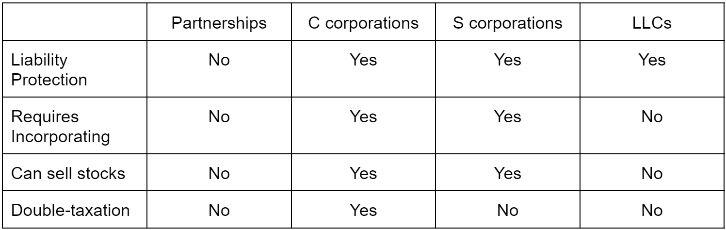 If you're going into business with two or more owners, the two most common business structures to choose from are partnerships and corporations. But even then, there's variations of both, each with their own pros and cons.
