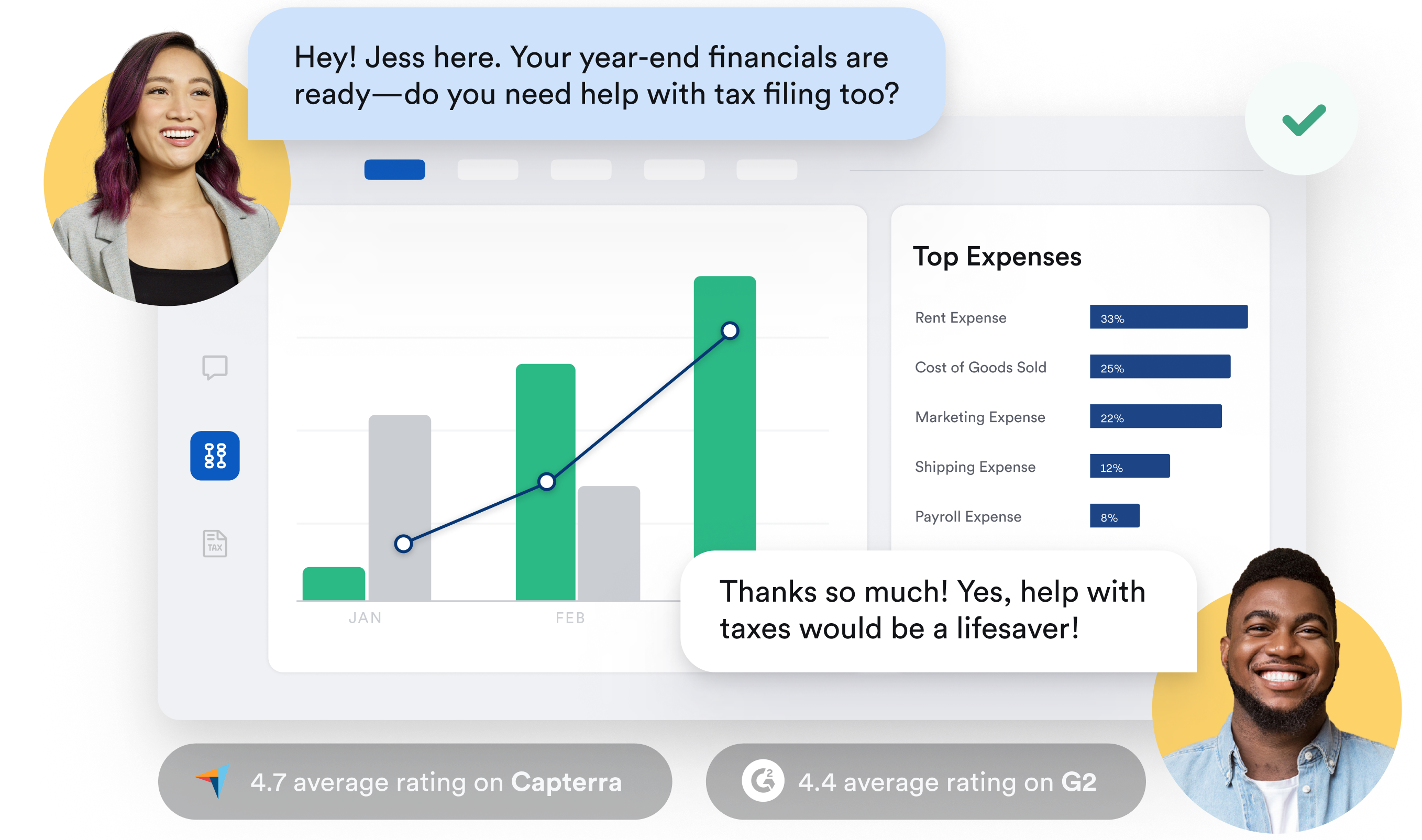 A year end package with everything you need to file comes standard with Bench. Upgrade your plan, and cross even more off your to-do list. With our Bookkeeping & Tax plan, you get expert tax prep, filing, and year-round tax advisory support.